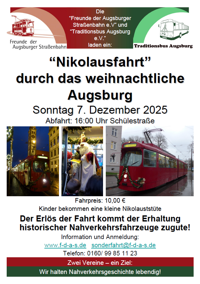 info(at)f-d-a-s(dot)de (Freunde der Augsburger Straßenbahn) oder info(at)traditionsbus-augsburg(dot)de (Traditionsbus Augsburg)
