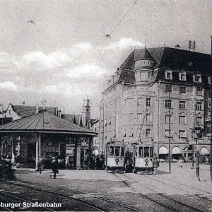 KaiserplatzZuvor verkehrte die blaue Linie auf der Strecke Königsplatz - Rotes Tor, auf der die Linie 3 heute ja auch wieder verkehrt. Die Strecke zwischen Kaiserplatz und Rotes Tor wurde ab 25. Januar 1904 aufgelassen. Die alte Ansichtskarte zeigt einen Triebwagen der ersten Serie am damaligen Kaiserplatz, der heute als Theodor-Heuss-Platz bekannt ist.